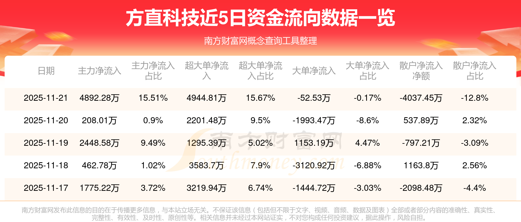 近5日資金流向一覽見下表: