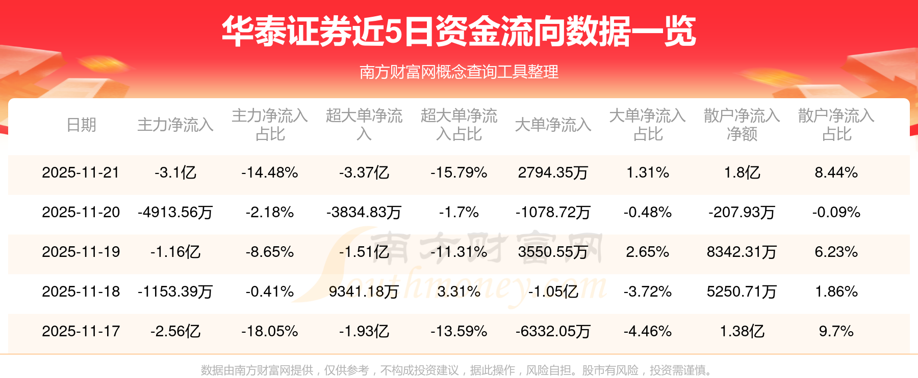 11月21日消息,華泰證券11月21日主力凈流出3.1億元,超大單凈流出3.37億元,大單凈流入2794.35萬(wàn)元,散戶凈流入1.8億元。