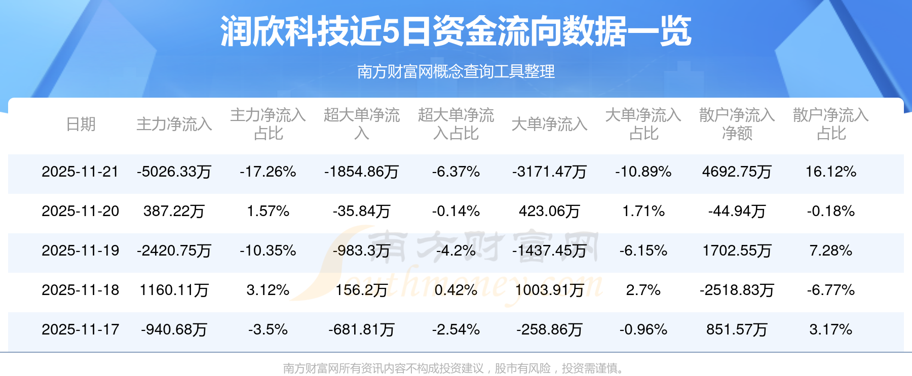 11月21日消息,潤(rùn)欣科技資金凈流出5026.33萬(wàn)元,超大單凈流出1854.86萬(wàn)元,換手率3.04%,成交金額2.91億元。