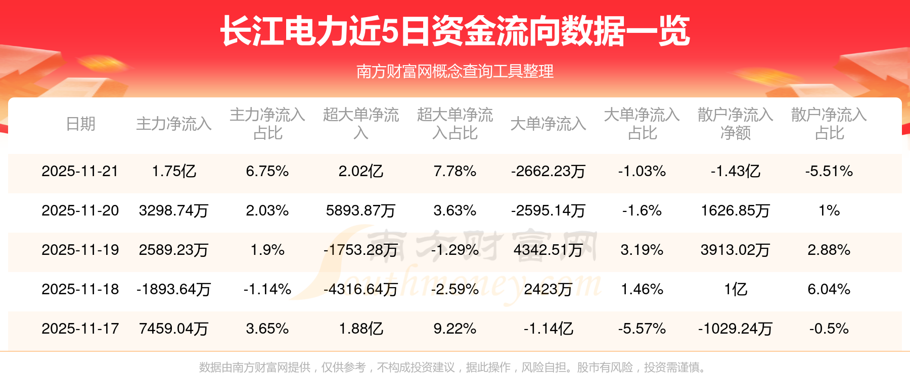 11月21日該股主力凈流入1.75億元,超大單凈流入2.02億元,大單凈流出2662.23萬元,中單凈流出3222.22萬元,散戶凈流出1.43億元。