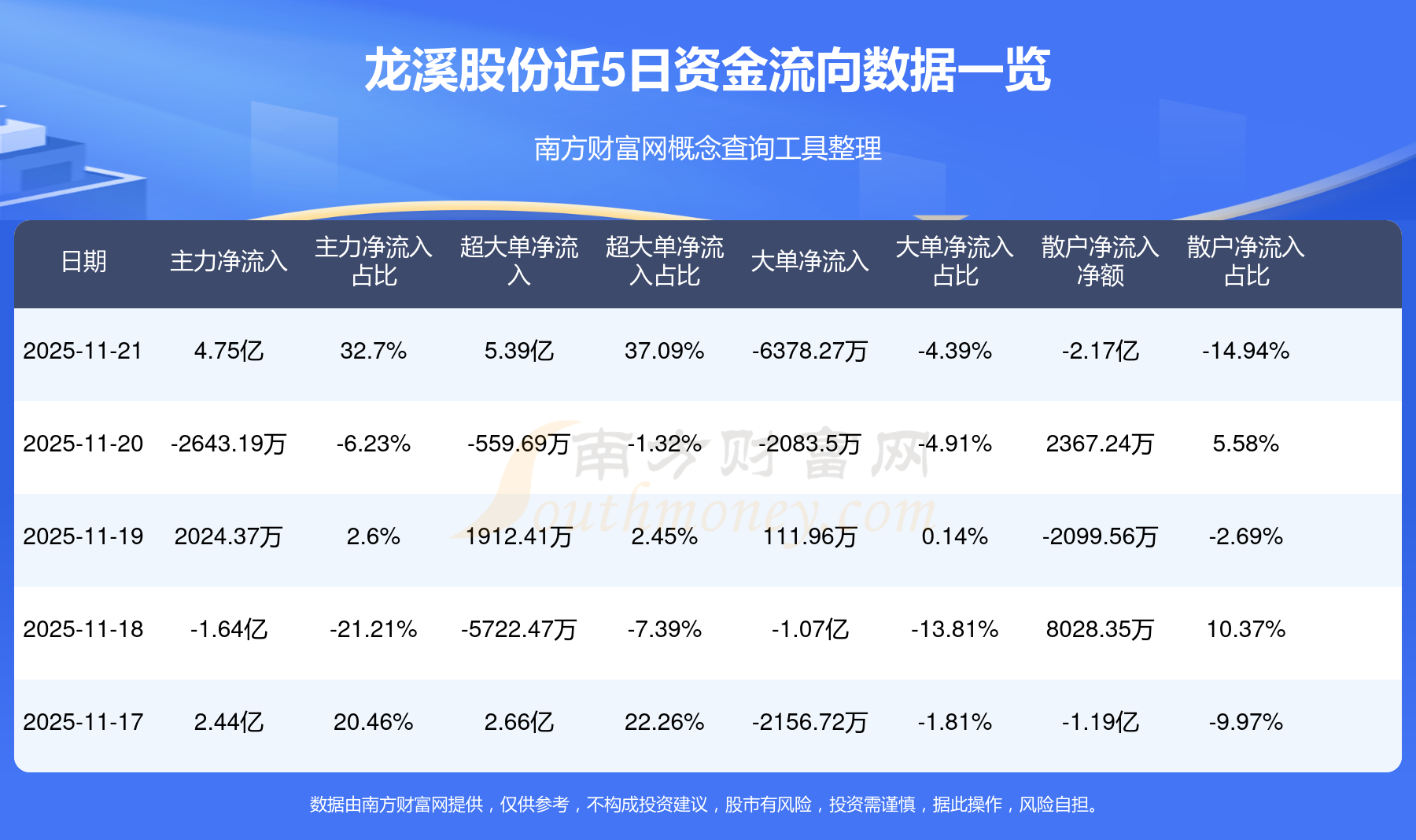11月21日消息,龍溪股份主力資金凈流入4.75億元,超大單資金凈流入5.39億元,散戶資金凈流出2.17億元。