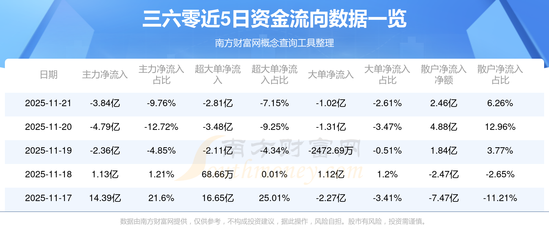 11月21日消息,三六零11月21日主力凈流出3.84億元,超大單凈流出2.81億元,大單凈流出1.02億元,散戶凈流入2.46億元。