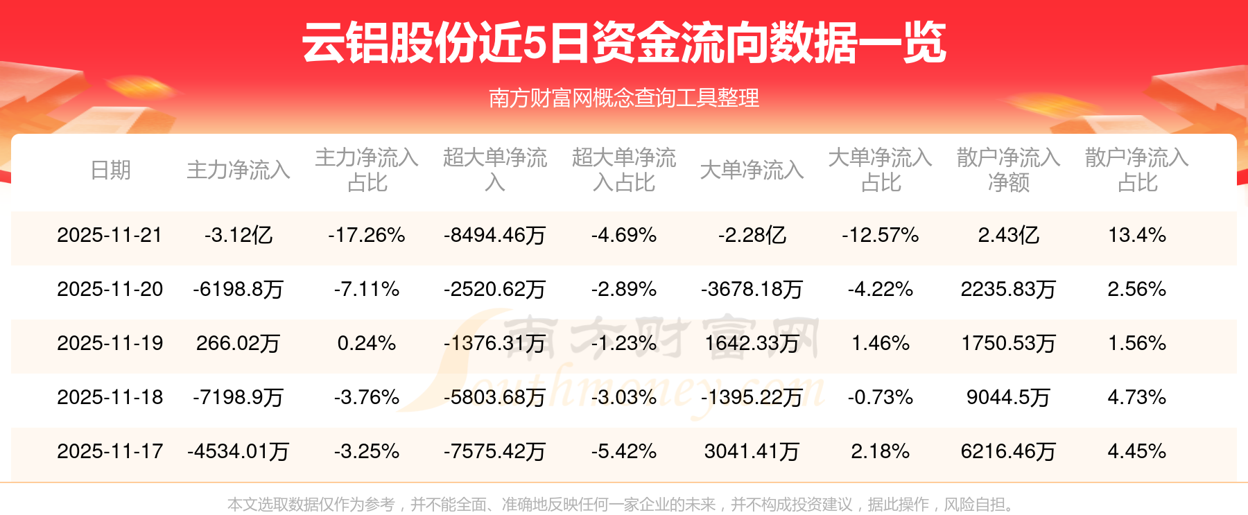 11月21日消息,云鋁股份11月21日主力凈流出3.12億元,超大單凈流出8494.46萬元,大單凈流出2.28億元,散戶凈流入2.43億元。