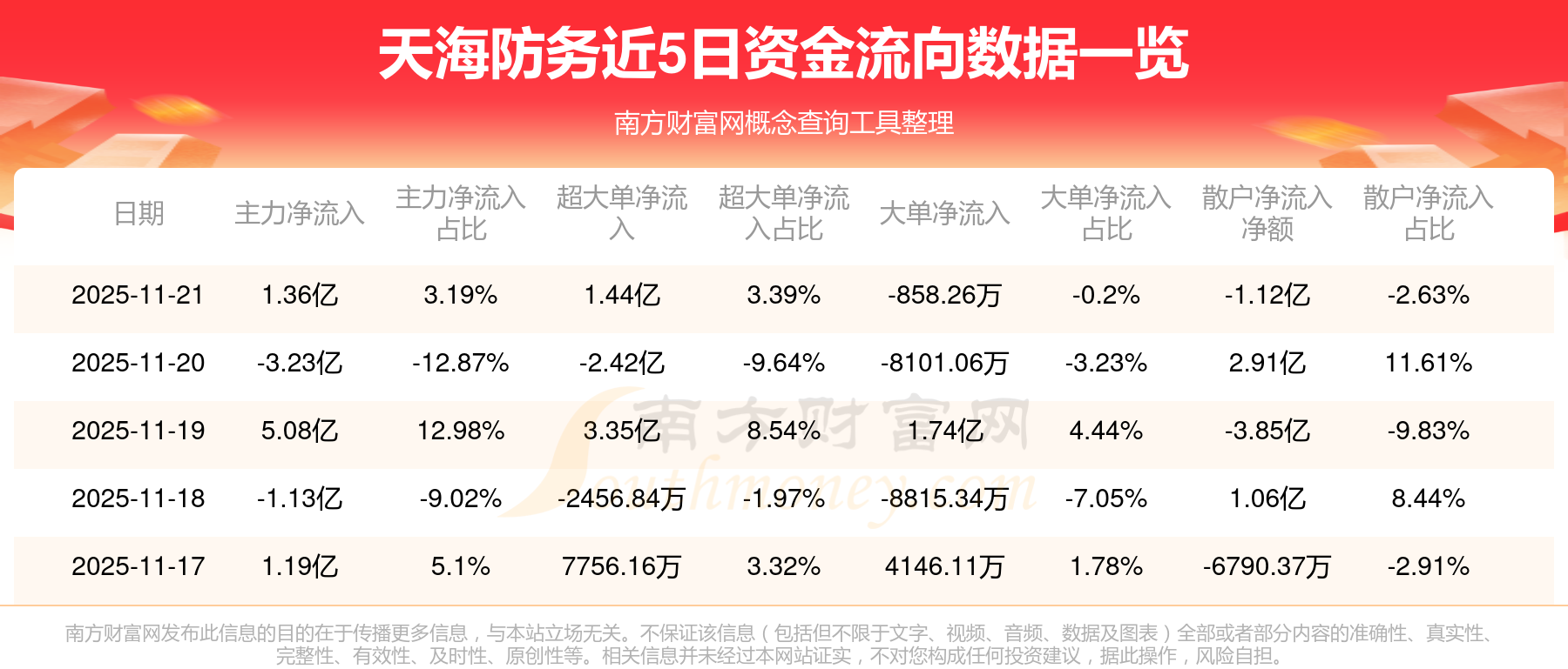 11月21日消息,天海防務(wù)11月21日主力凈流入1.36億元,超大單凈流入1.44億元,大單凈流出858.26萬(wàn)元,散戶(hù)凈流出1.12億元。