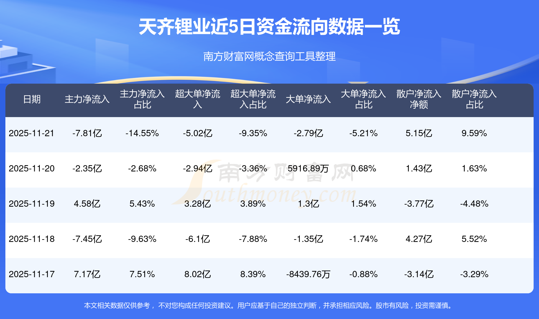 11月21日消息,天齊鋰業(yè)主力凈流出7.81億元,超大單凈流出5.02億元,散戶凈流入5.15億元。