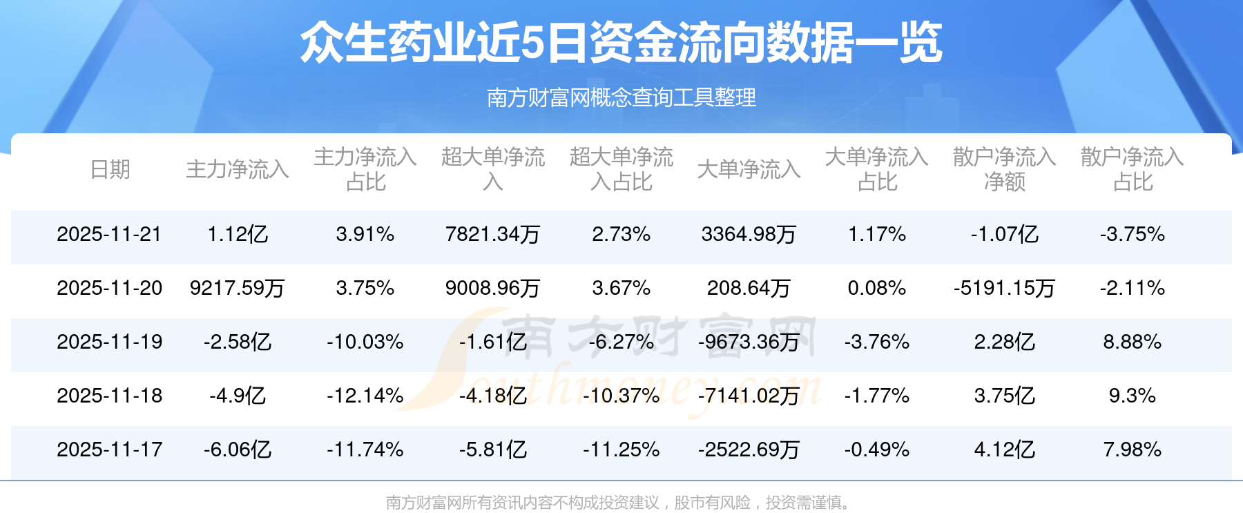 11月21日消息,眾生藥業(yè)資金凈流入1.12億元,超大單資金凈流入7821.34萬元,換手率15.81%,成交金額28.64億元。