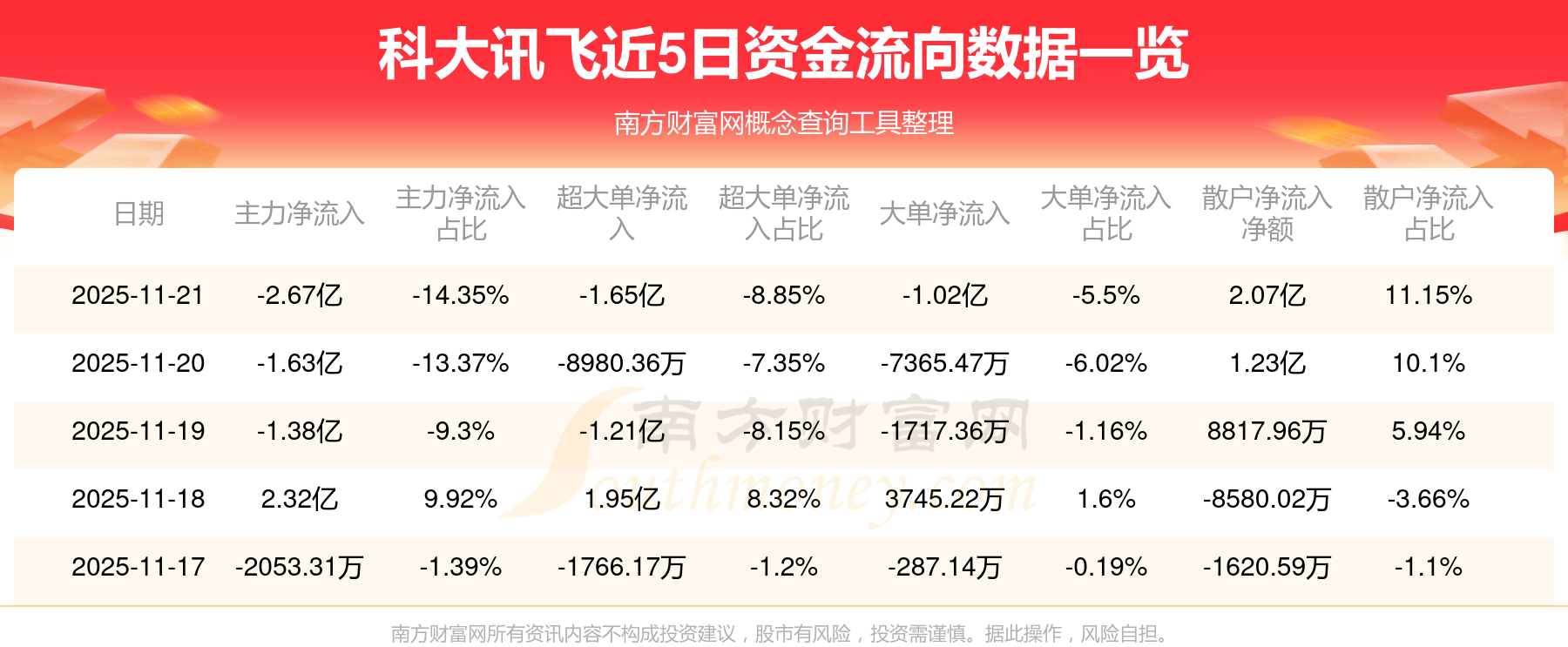 11月21日消息,科大訊飛主力凈流出2.67億元,超大單凈流出1.65億元,散戶凈流入2.07億元。