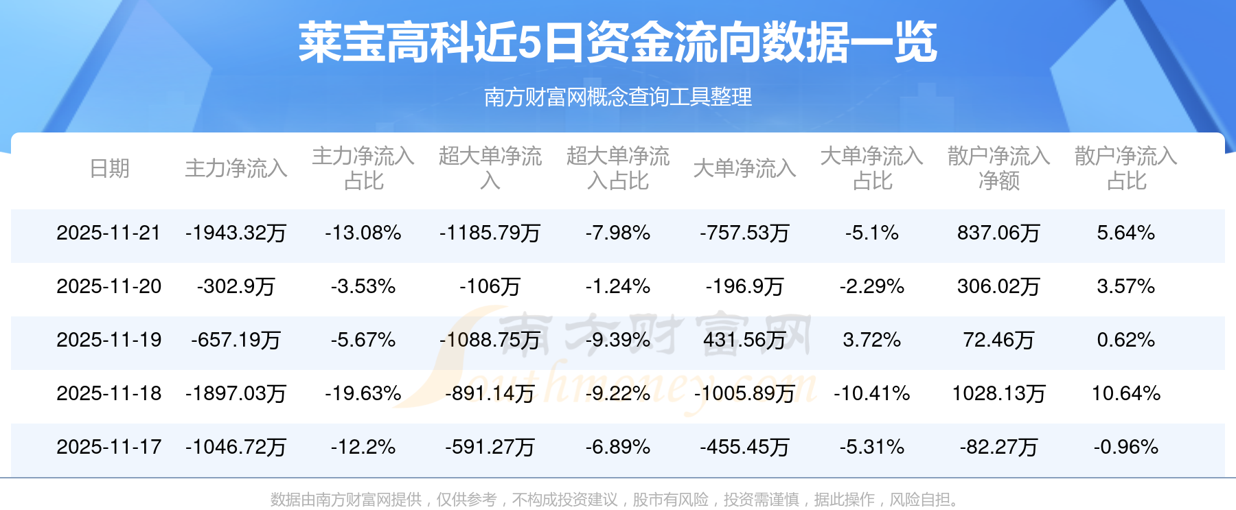 11月21日消息,萊寶高科主力凈流出1943.32萬元,超大單凈流出1185.79萬元,散戶凈流入837.06萬元。