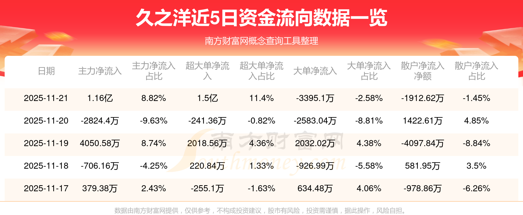 11月20日消息,久之洋資金凈流出1.16億元,超大單資金凈流入1.5億元,最新報(bào)48.600元,換手率15.15%,成交總金額13.18億元。