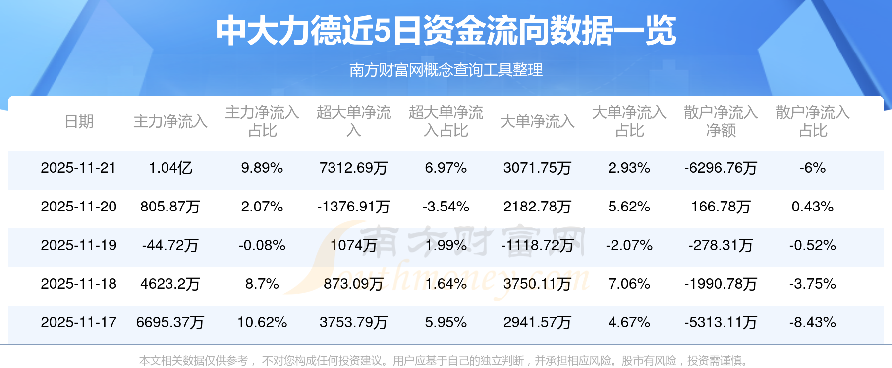 11月21日消息,中大力德主力凈流入1.04億元,超大單凈流入7312.69萬元,散戶凈流出6296.76萬元。