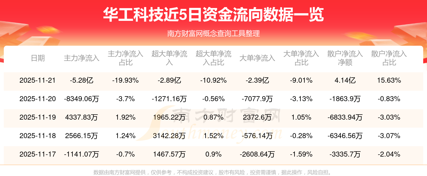 11月21日消息,華工科技11月21日主力凈流出5.28億元,超大單凈流出2.89億元,大單凈流出2.39億元,散戶凈流入4.14億元。