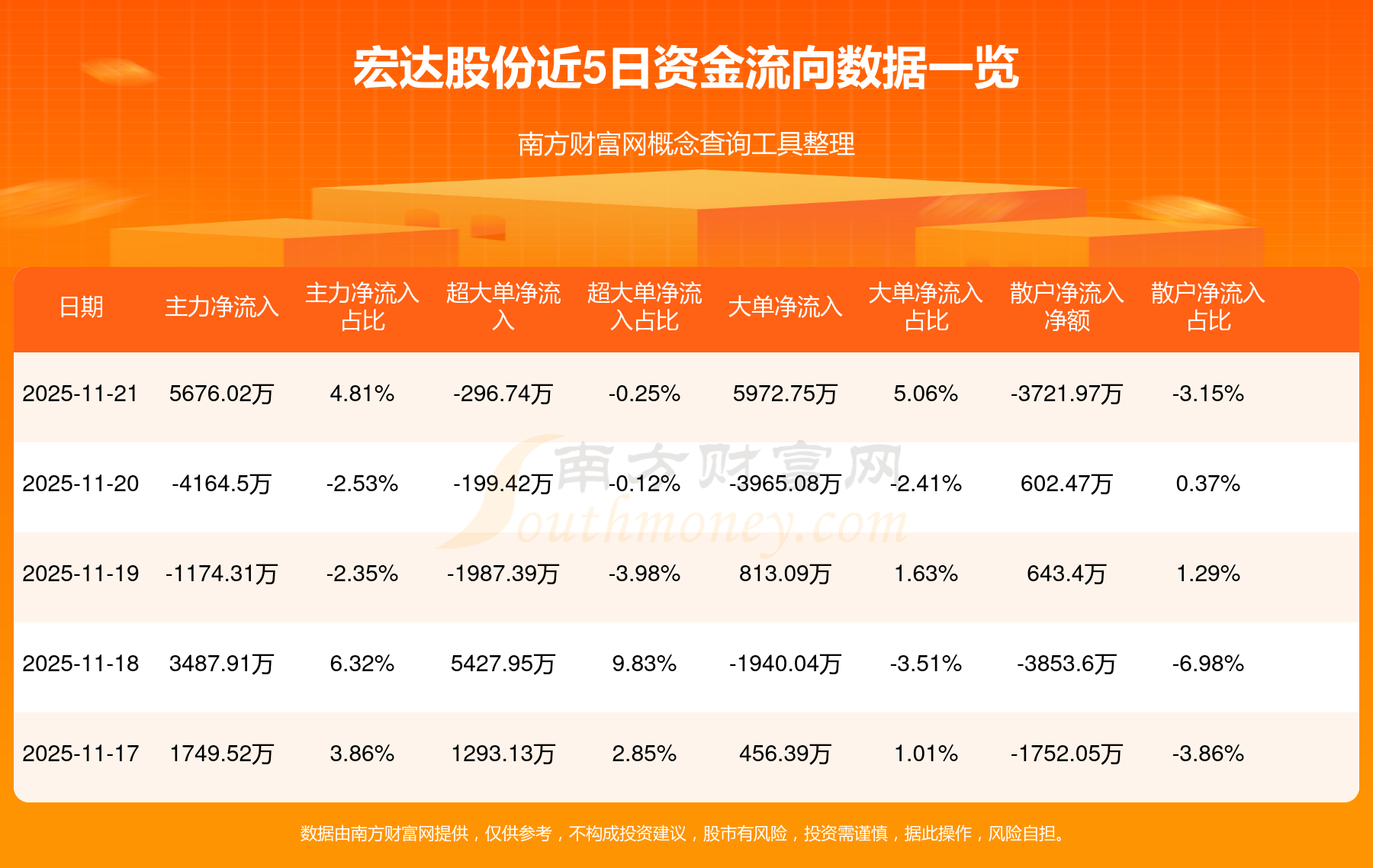 11月21日消息,宏達(dá)股份主力凈流入5676.02萬(wàn)元,超大單凈流出296.74萬(wàn)元,散戶凈流出3721.97萬(wàn)元。