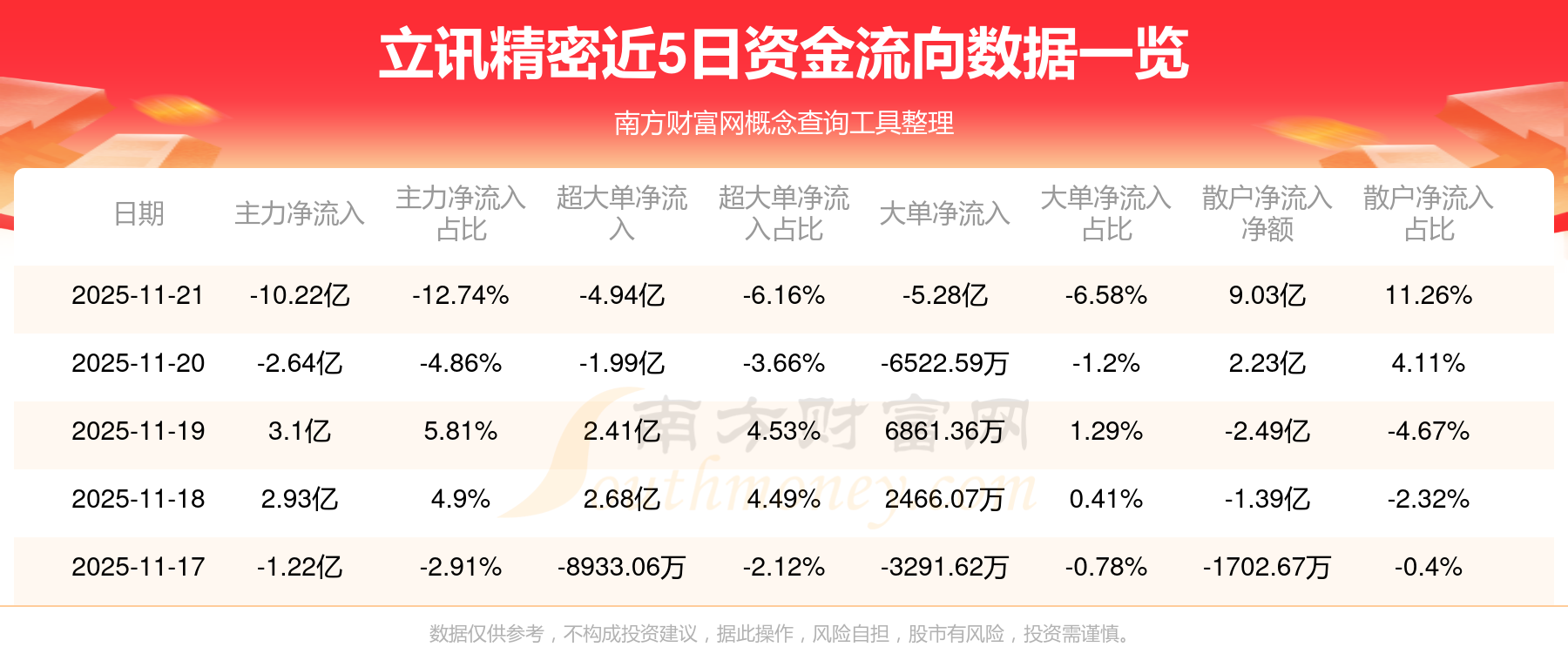 資金流向數(shù)據(jù)方面,11月21日主力資金凈流流出10.22億元,超大單資金凈流出4.94億元,大單資金凈流出5.28億元,散戶資金凈流入9.03億元。