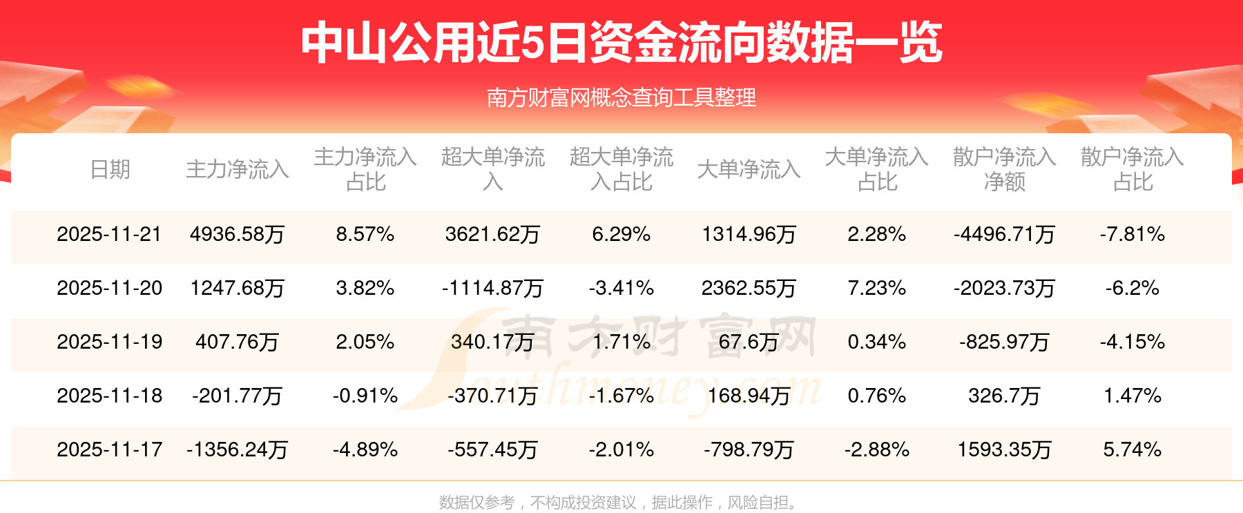 11月21日消息,中山公用主力資金凈流入4936.58萬元,超大單資金凈流入3621.62萬元,散戶資金凈流出4496.71萬元。
