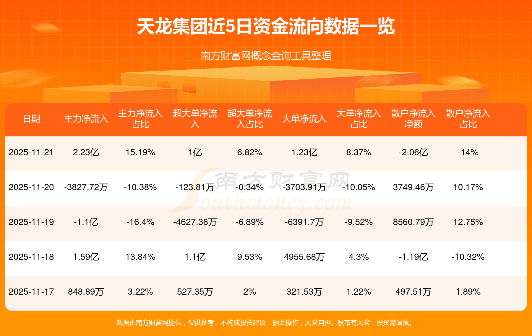 11月21日消息,天龍集團主力凈流入2.23億元,超大單凈流入1億元,散戶凈流出2.06億元。