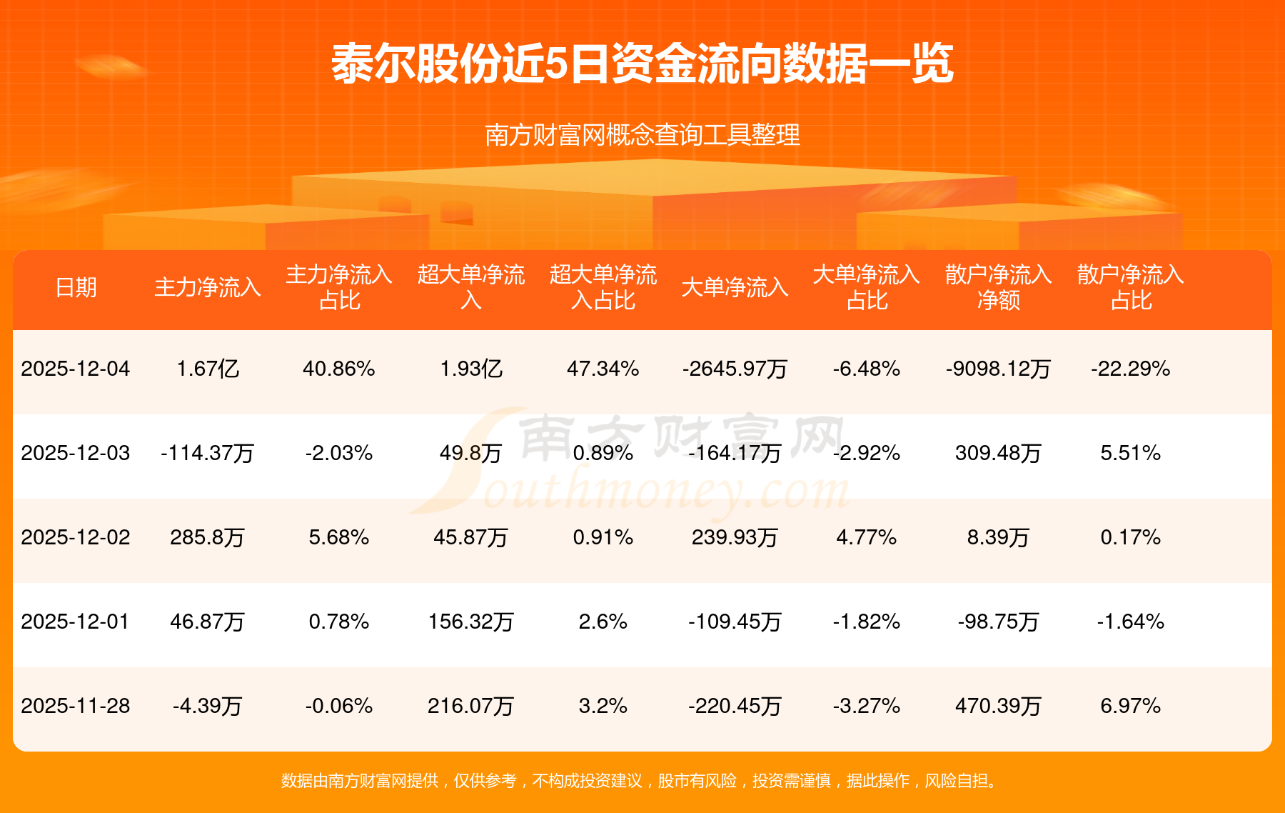 12月4日消息,泰爾股份資金凈流入1.67億元,超大單資金凈流入1.93億元,換手率14.32%,成交金額5.3億元。
