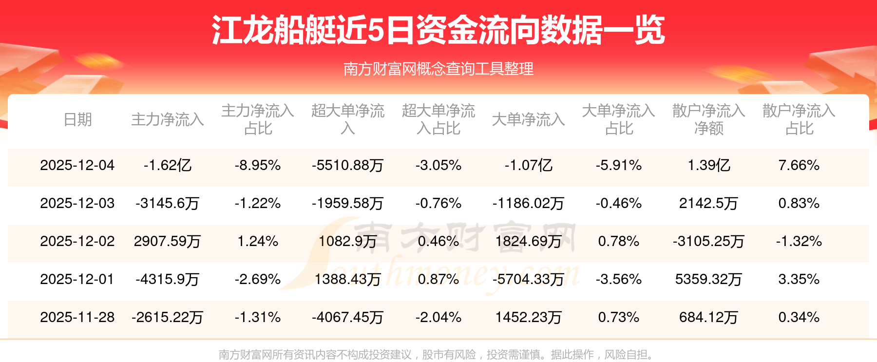 12月4日消息,江龍船艇資金凈流出1.62億元,超大單資金凈流出5510.88萬元,換手率21.04%,成交金額10.81億元。