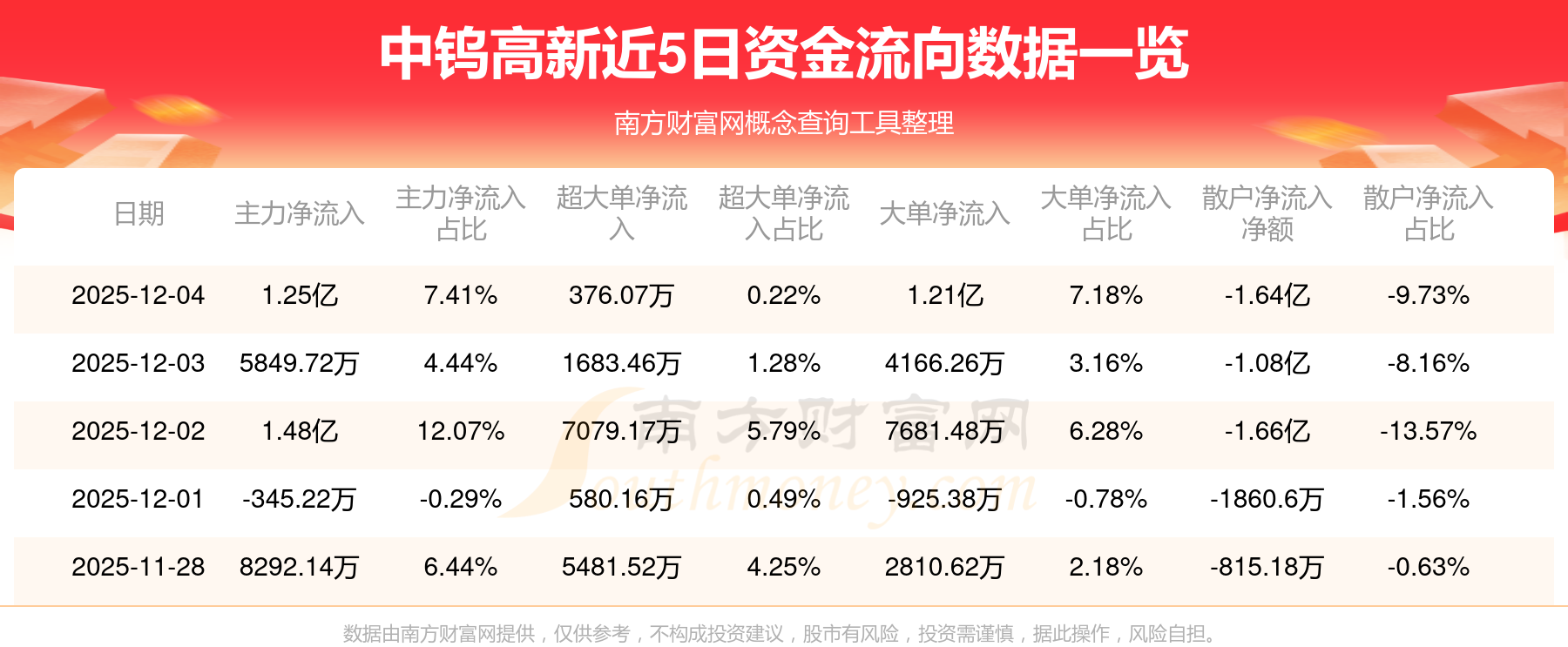 12月4日消息,中鎢高新資金凈流入1.25億元,超大單凈流入376.07萬元,換手率6.68%,成交金額22.28億元。