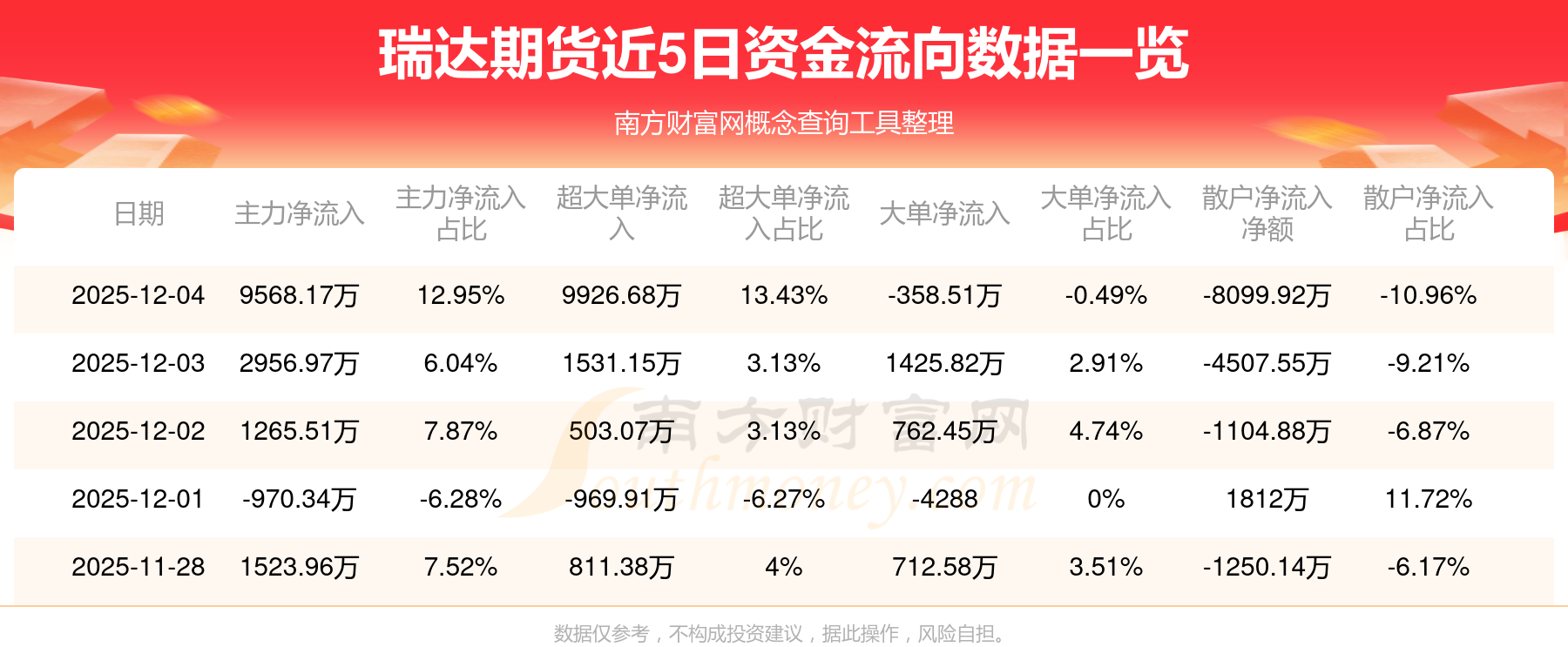 12月4日消息,瑞達(dá)期貨資金凈流入9568.17萬(wàn)元,超大單凈流入9926.68萬(wàn)元,換手率6.31%,成交金額7.05億元。