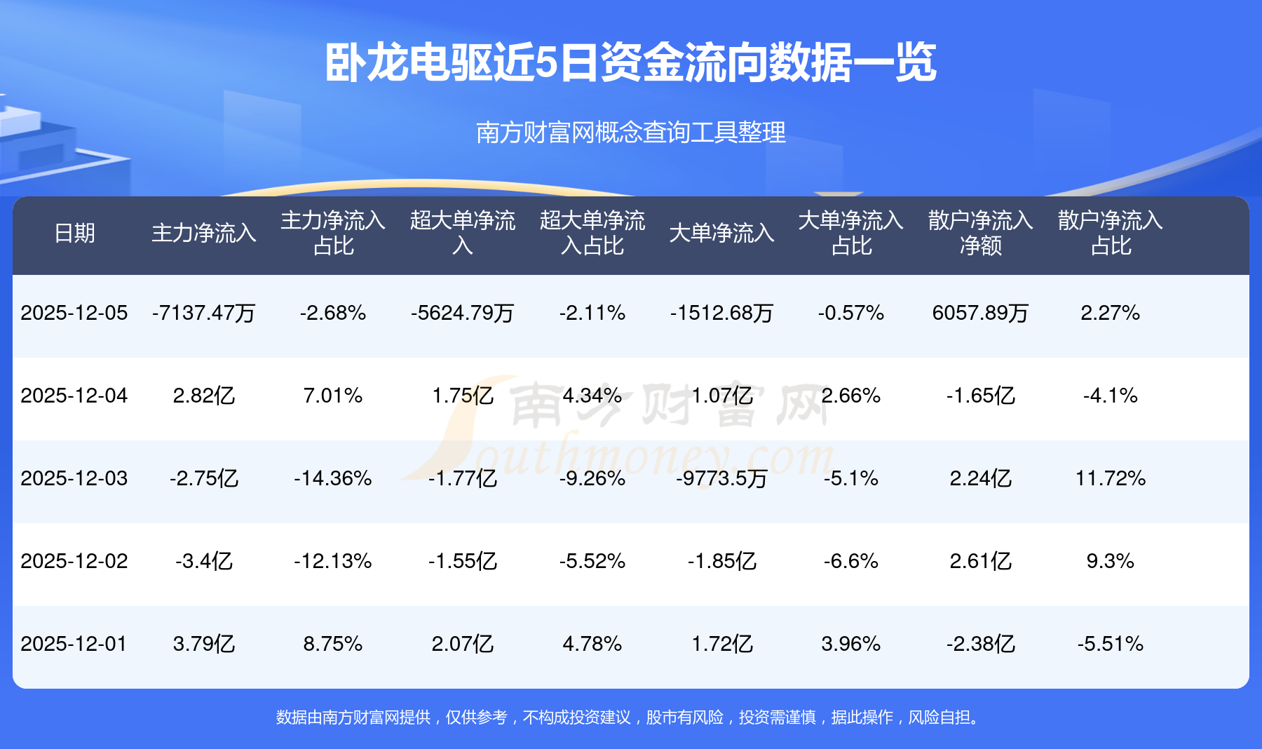 12月5日消息,臥龍電驅(qū)資金凈流出7137.47萬(wàn)元,超大單凈流出5624.79萬(wàn)元,換手率4.05%,成交金額26.65億元。