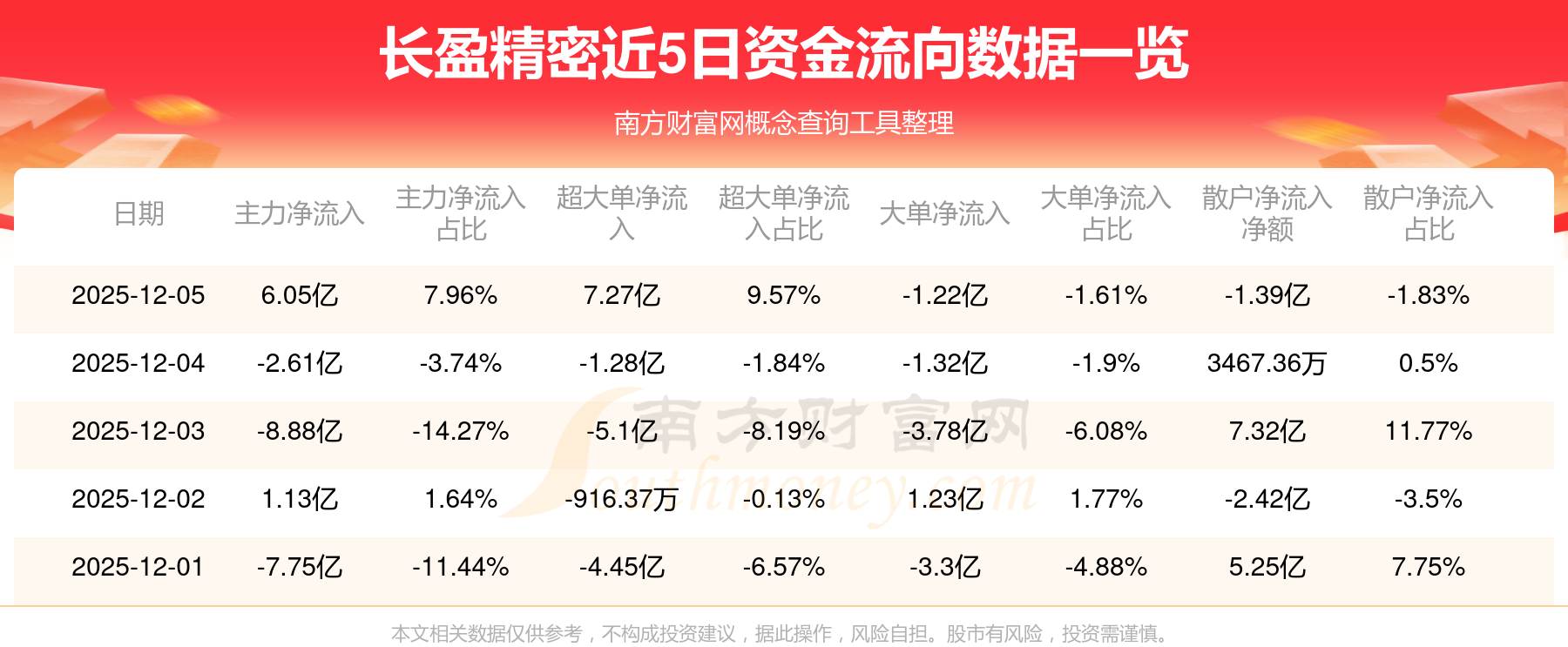 12月5日消息,長(zhǎng)盈精密12月5日主力凈流入6.05億元,超大單凈流入7.27億元,大單凈流出1.22億元,散戶凈流出1.39億元。