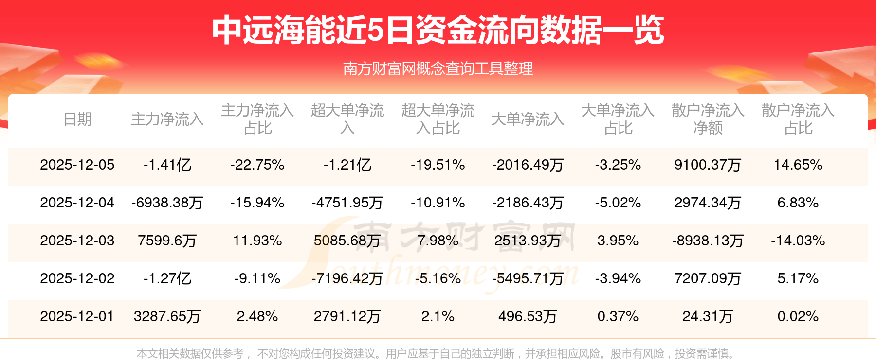 12月5日主力資金凈流出1.41億元,超大單資金凈流出1.21億元,換手率1.56%,成交金額6.15億元。