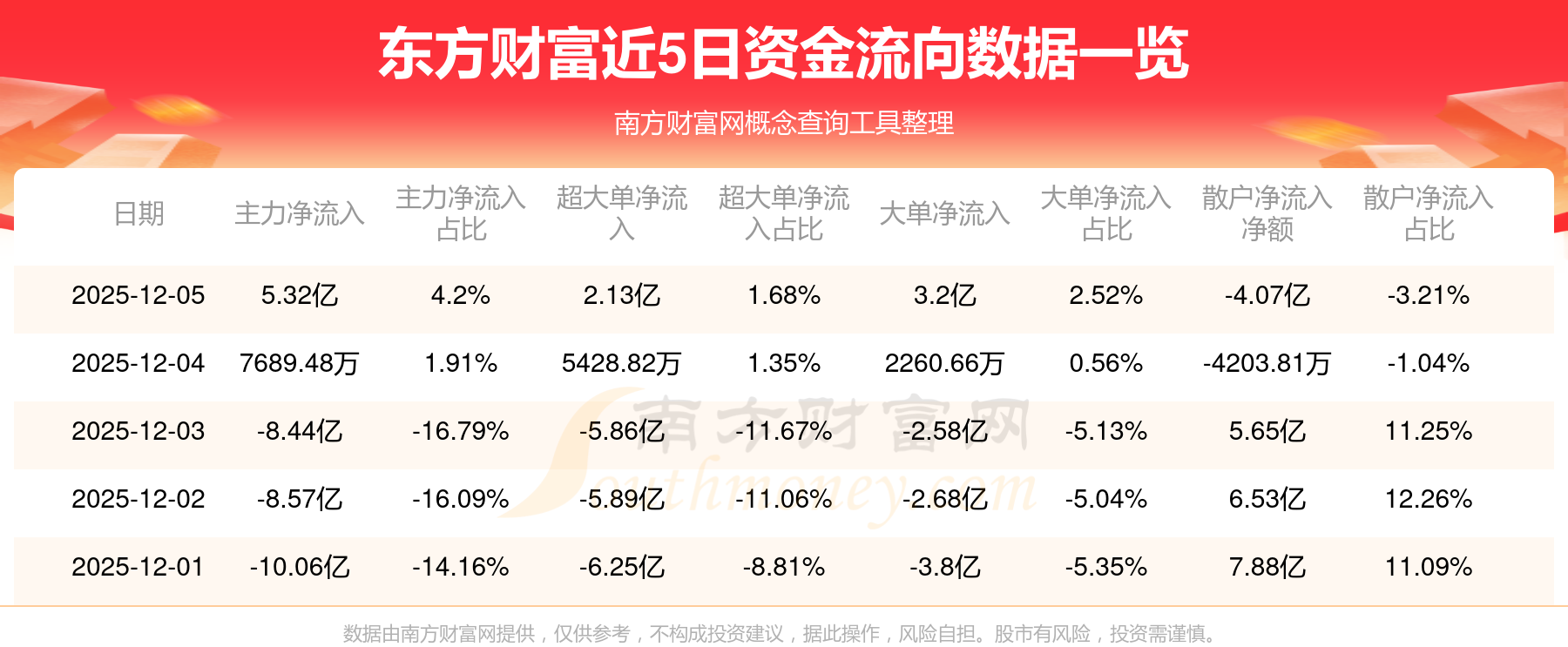 12月5日消息,東方財富主力資金凈流入5.32億元,超大單資金凈流入2.13億元,散戶資金凈流出4.07億元。