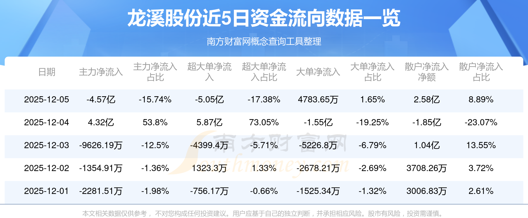 12月5日消息,龍溪股份主力資金凈流出4.57億元,超大單資金凈流出5.05億元,散戶資金凈流入2.58億元。