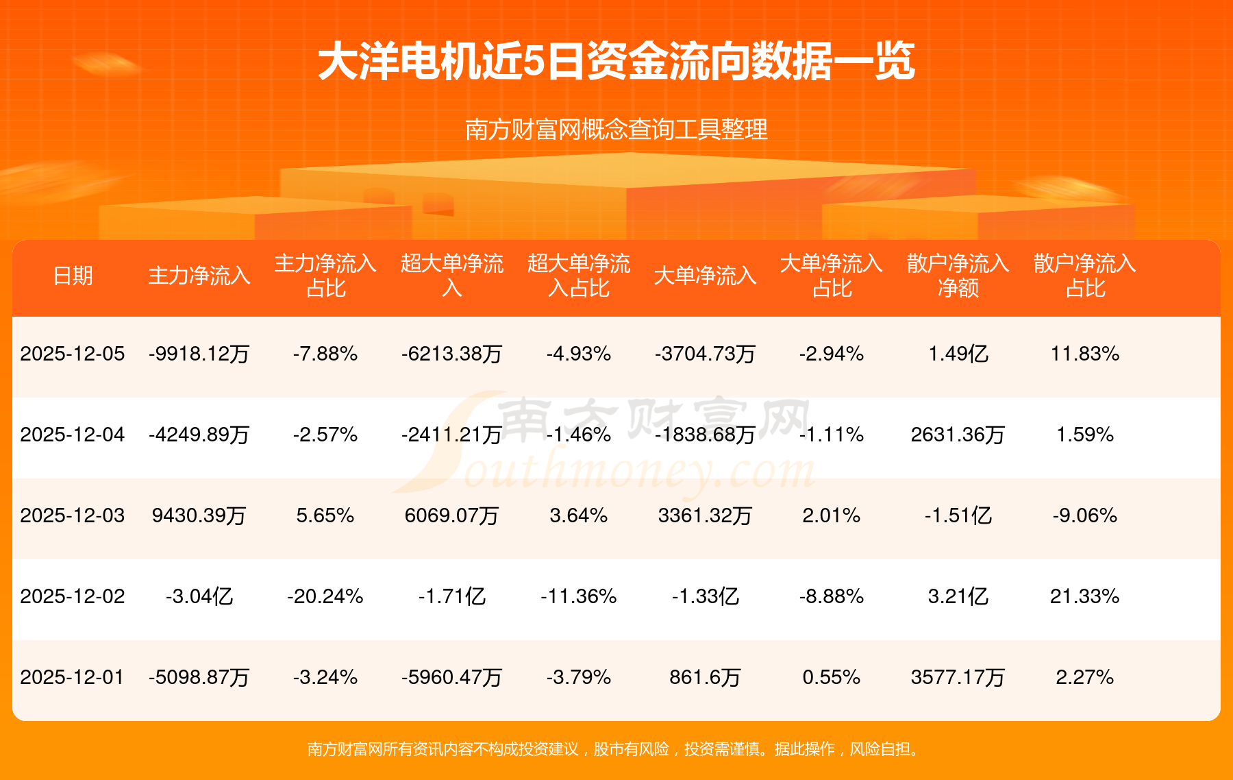 12月5日消息,大洋電機(jī)主力資金凈流出9918.12萬元,超大單資金凈流出6213.38萬元,散戶資金凈流入1.49億元。