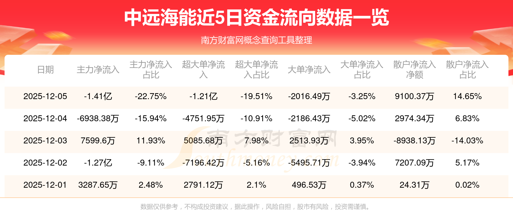 資金流向數(shù)據(jù)方面,12月5日主力資金凈流流出1.41億元,超大單資金凈流出1.21億元,大單資金凈流出2016.49萬元,散戶資金凈流入9100.37萬元。