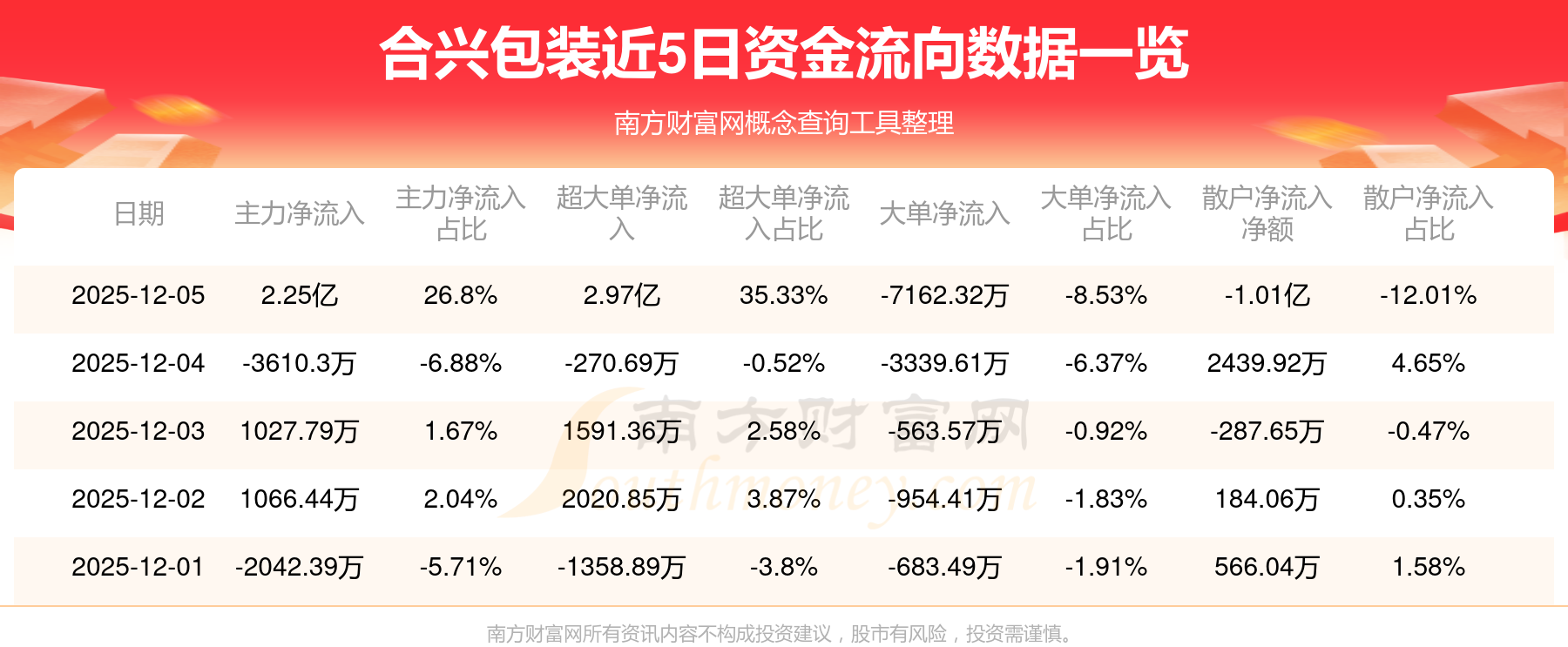 12月5日資金流向統(tǒng)計(jì):合興包裝資金流向一覽表