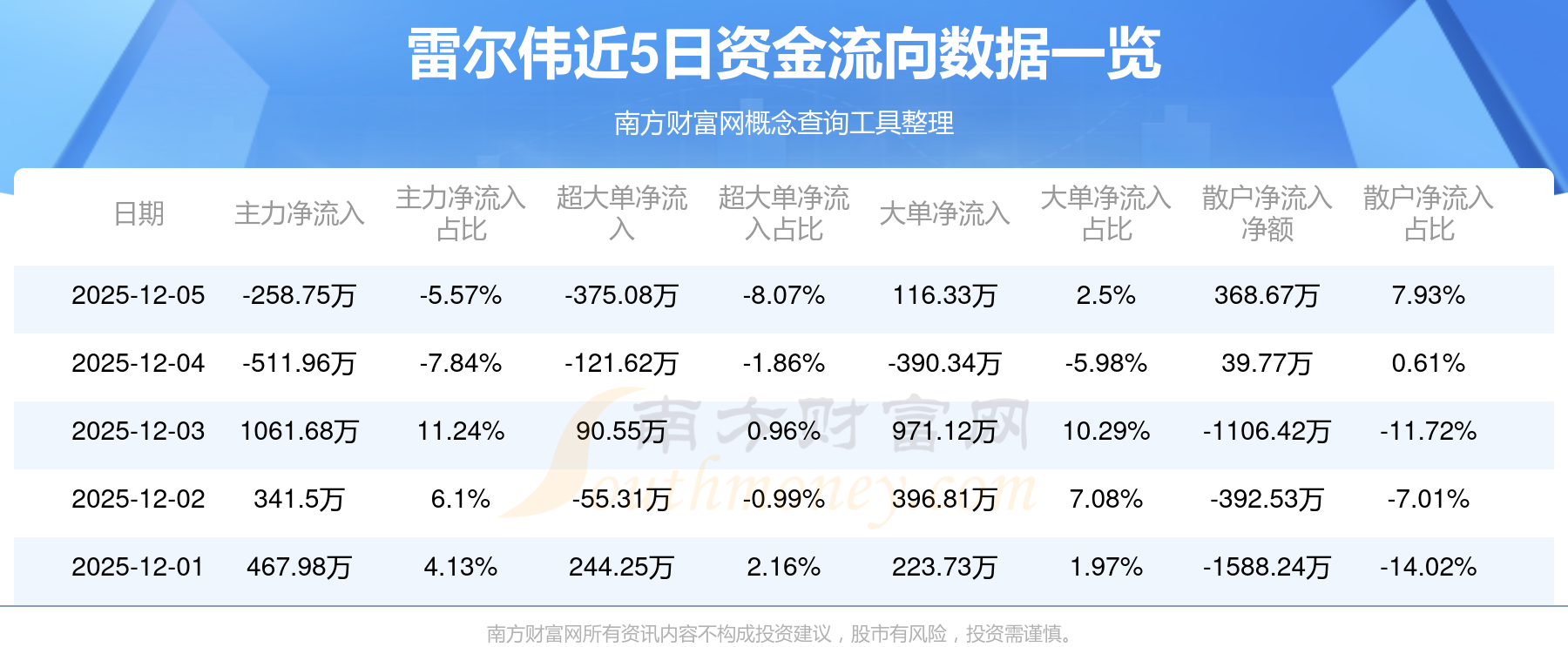 12月5日消息,雷爾偉主力資金凈流出258.75萬(wàn)元,超大單資金凈流出375.08萬(wàn)元,散戶資金凈流入368.67萬(wàn)元。