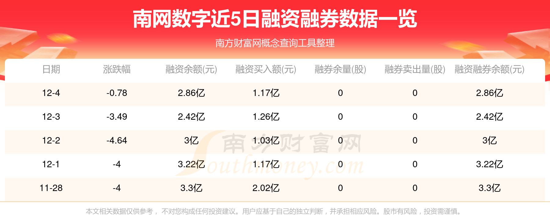南網(wǎng)數(shù)字12月4日融券信息顯示,融資方面,當日融資買入1.17億元,融資償還7241.07萬元,融資凈買額4427.79萬元。近5日融資融券數(shù)據(jù)一覽見下表: