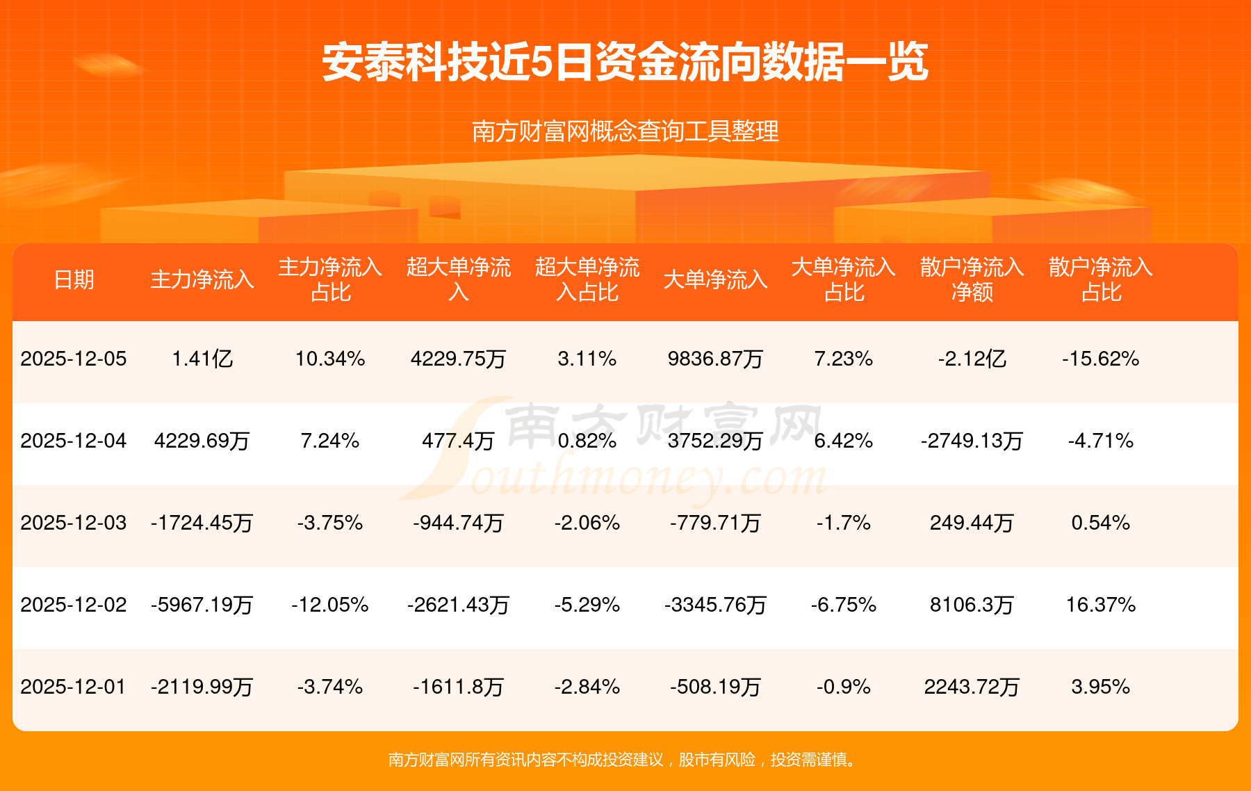 12月5日消息,安泰科技12月5日主力資金凈流入1.41億元,超大單資金凈流入4229.75萬元,大單資金凈流入9836.87萬元,散戶資金凈流出2.12億元。