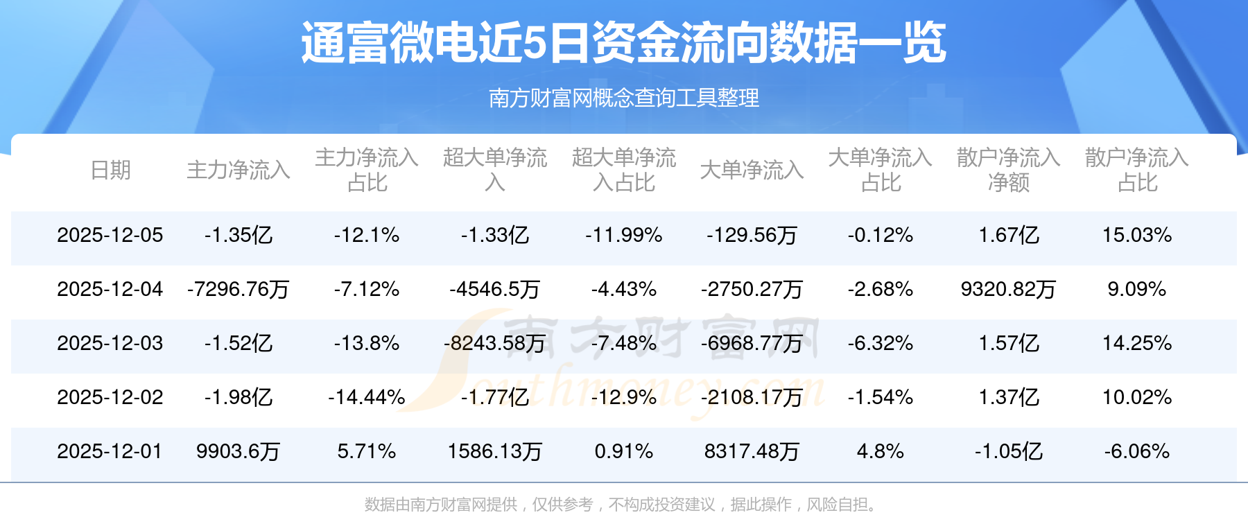 12月5日消息,通富微電主力資金凈流出1.35億元,超大單資金凈流出1.33億元,散戶資金凈流入1.67億元。