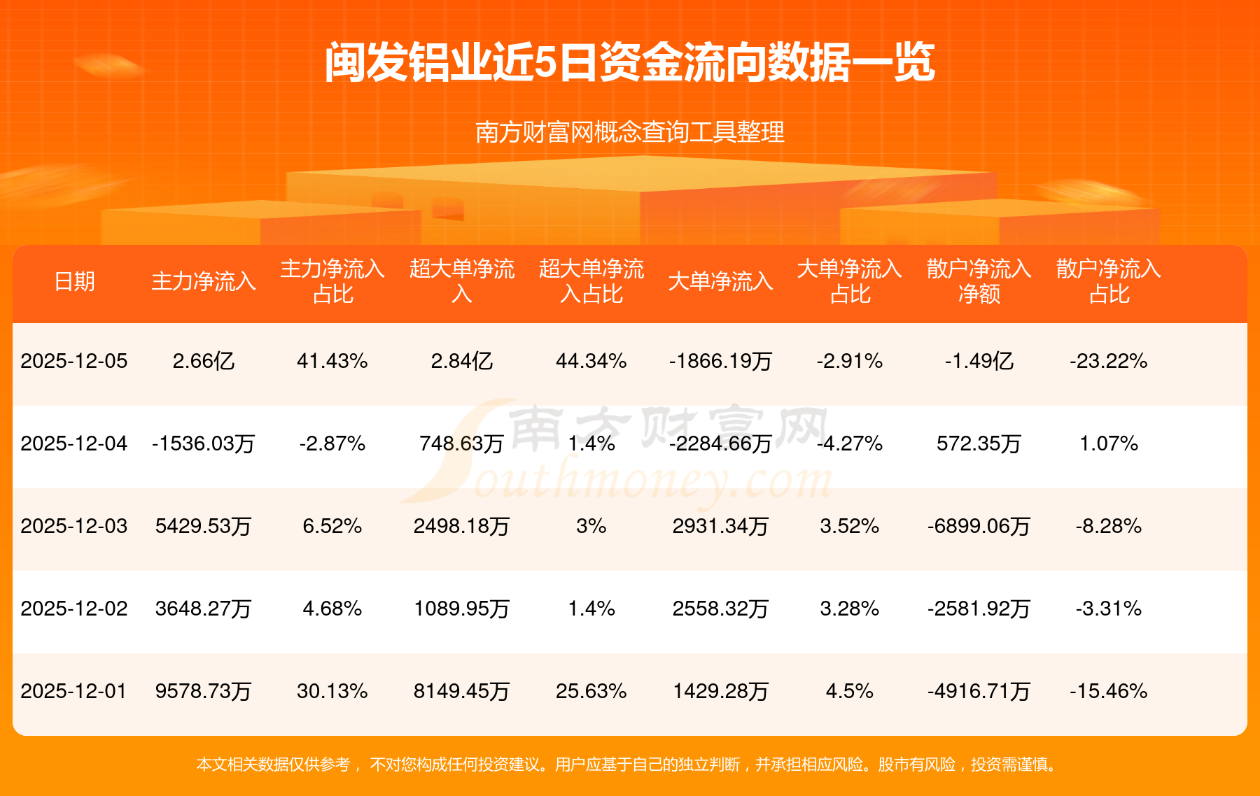 12月5日消息,閩發(fā)鋁業(yè)12月5日主力凈流入2.66億元,超大單凈流入2.84億元,大單凈流出1866.19萬元,散戶凈流出1.49億元。