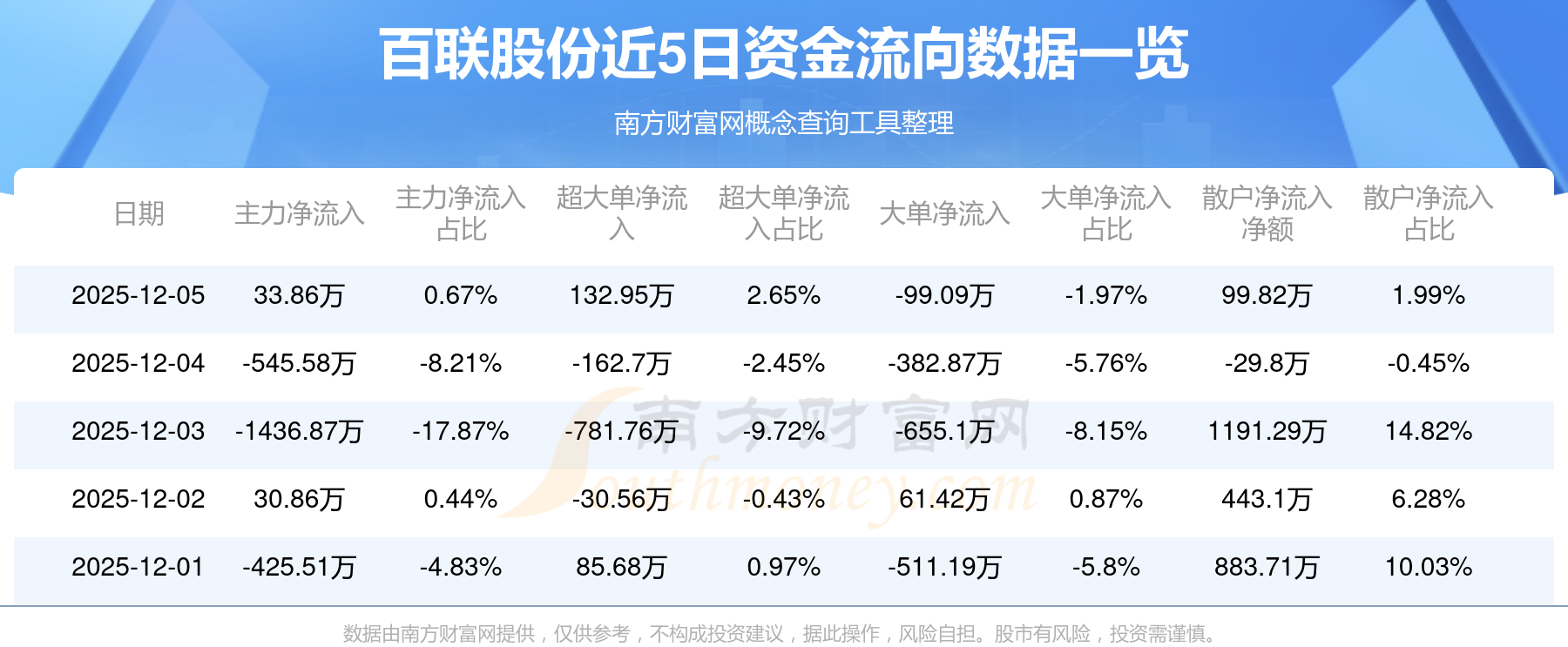 12月5日消息,百聯(lián)股份12月5日主力凈流入33.86萬元,超大單凈流入132.95萬元,大單凈流出99.09萬元,散戶凈流入99.82萬元。