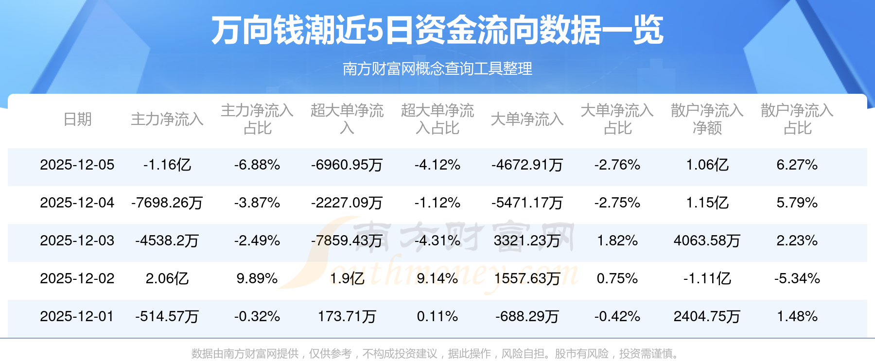 12月5日消息,萬向錢潮主力凈流出1.16億元,超大單凈流出6960.95萬元,散戶凈流入1.06億元。