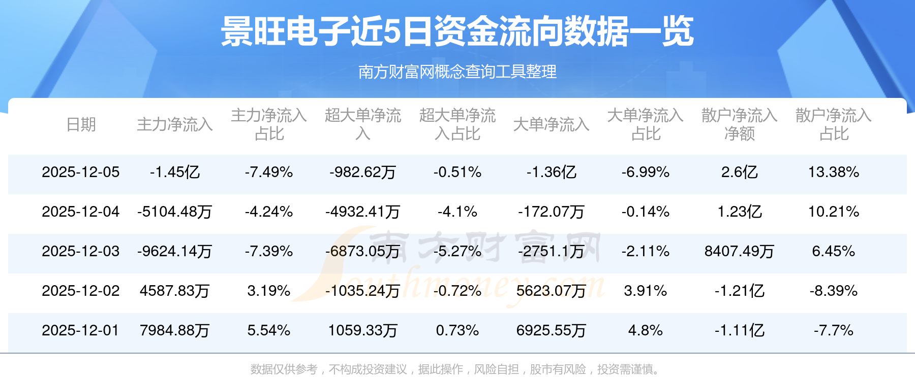 12月5日消息,景旺電子主力資金凈流出1.45億元,超大單資金凈流出982.62萬元,散戶資金凈流入2.6億元。