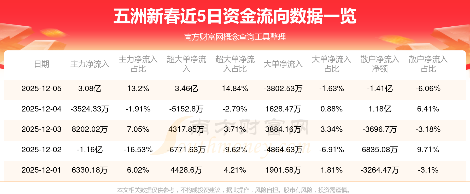 12月5日消息,五洲新春主力凈流入3.08億元,超大單凈流入3.46億元,散戶凈流出1.41億元。