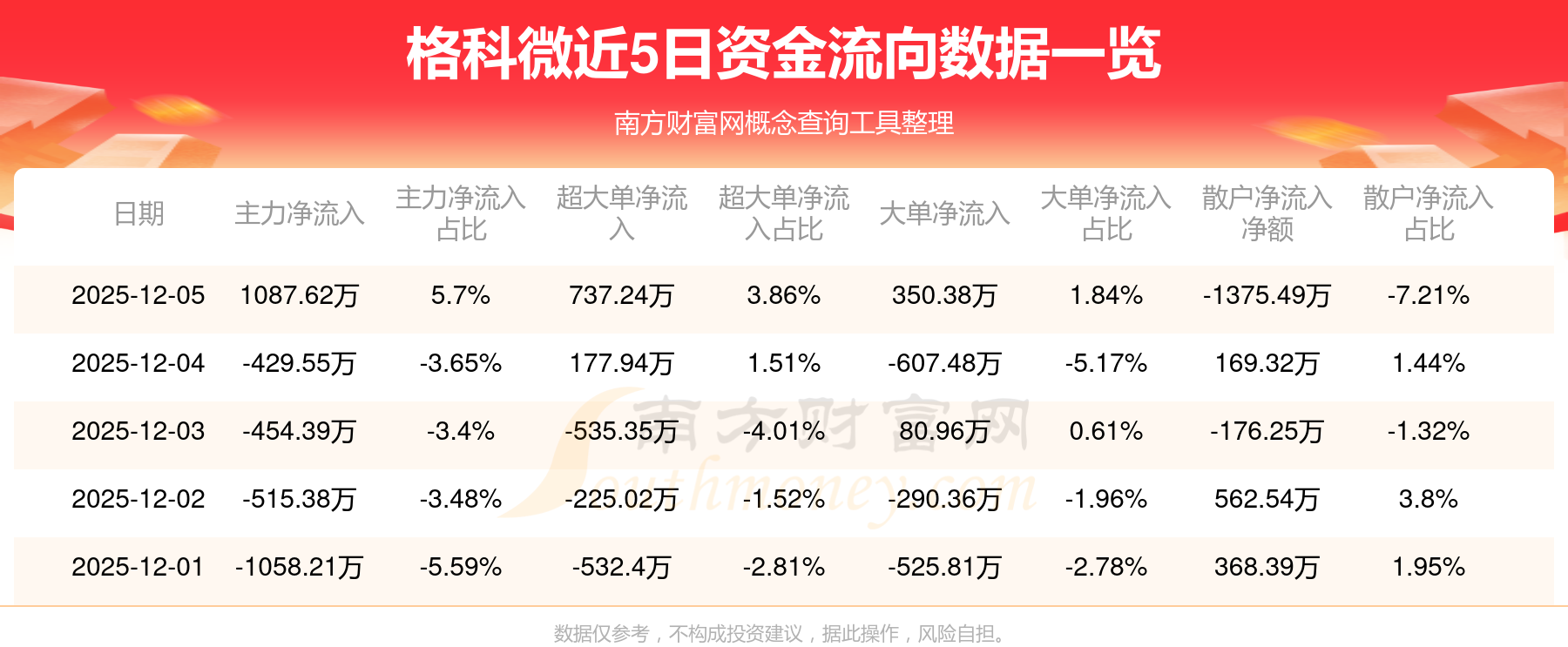 資金流向數(shù)據(jù)方面,12月5日主力資金凈流流入1087.62萬元,超大單資金凈流入737.24萬元,大單資金凈流入350.38萬元,散戶資金凈流出1375.49萬元。