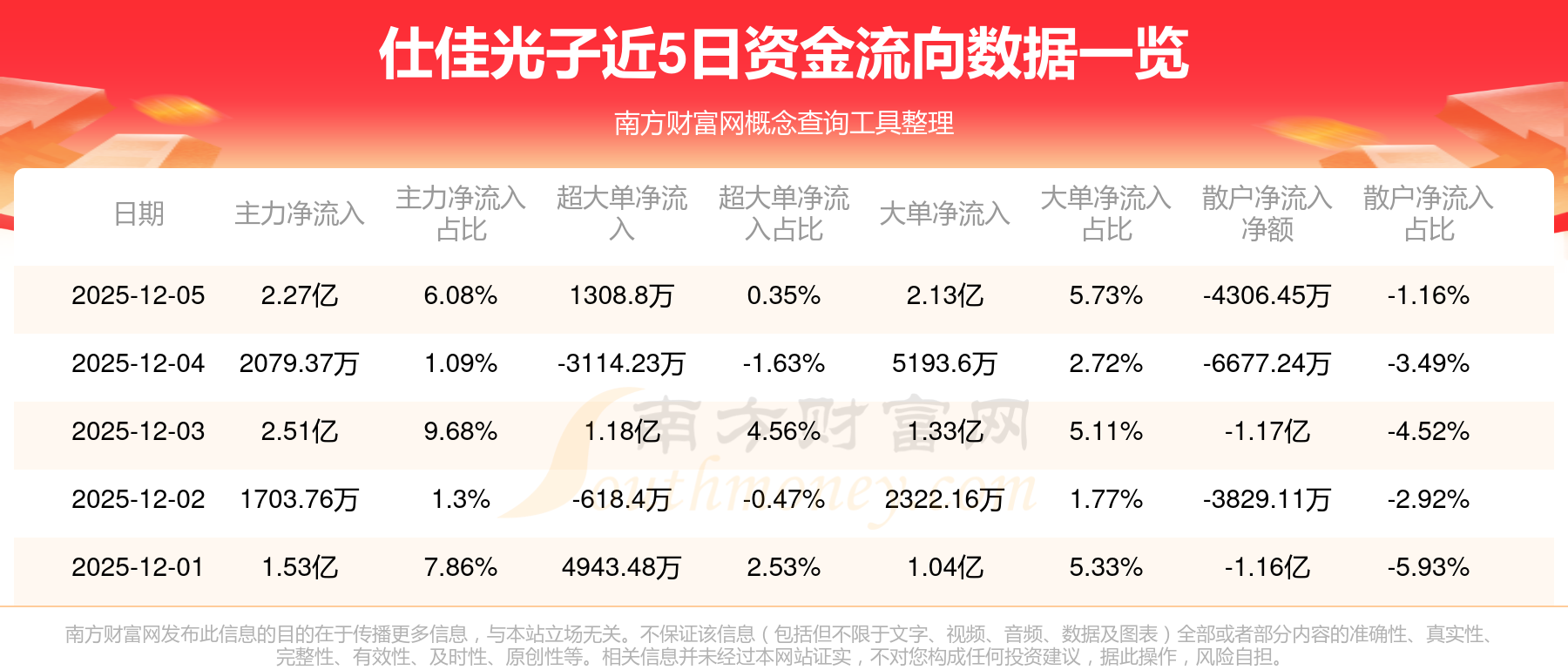 12月5日消息,仕佳光子主力資金凈流入2.27億元,超大單資金凈流入1308.8萬元,散戶資金凈流出4306.45萬元。