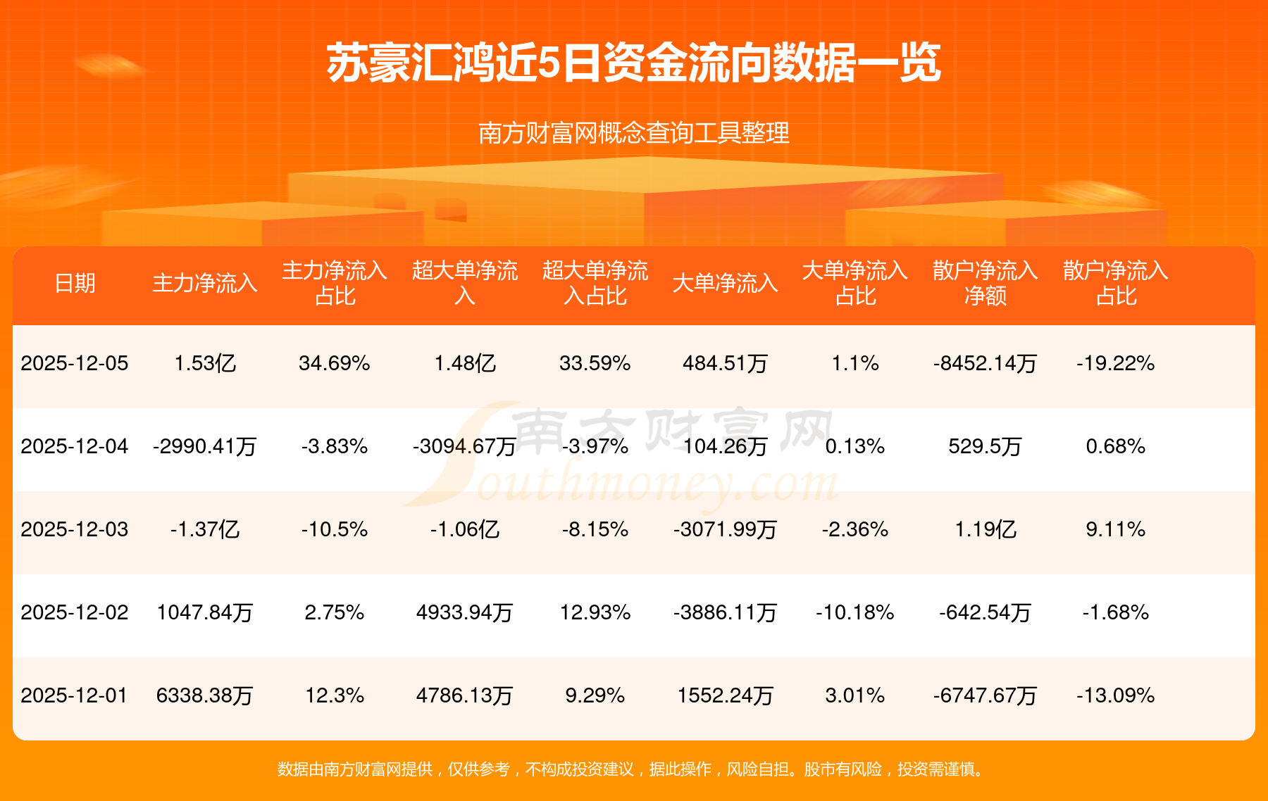 12月5日消息,蘇豪匯鴻主力資金凈流入1.53億元,超大單資金凈流入1.48億元,散戶資金凈流出8452.14萬元。