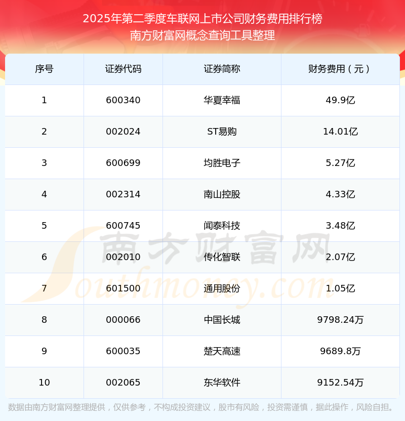 2025年第二季度,車聯(lián)網(wǎng)上市公司財務費用排名如下:華夏幸福(600340)的財務費用總額高達49.9億,ST易購(002024)和均勝電子(600699)分別位居第二和第三,南山控股(002314)、聞泰科技(600745)、傳化智聯(lián)(002010)、通用股份(601500)、中國長城(000066)、楚天高速(600035)、東華軟件(002065)分別進入前十,其財務費用總額分別排名第4-10名。