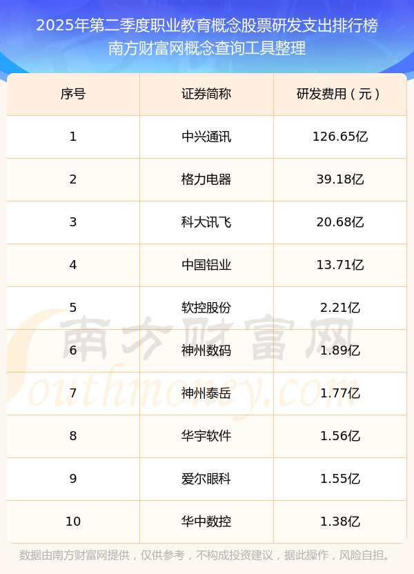 2025年第二季度,職業(yè)教育概念股票研發(fā)支出排行榜中,中興通訊(000063)研發(fā)支出總額高達(dá)126.65億,格力電器(000651)和科大訊飛(002230)排名第二和第三,中國鋁業(yè)(601600)、軟控股份(002073)、神州數(shù)碼(000034)、神州泰岳(300002)、華宇軟件(300271)、愛爾眼科(300015)、華中數(shù)控(300161)進(jìn)入前十,研發(fā)支出總額分別排名第4-10名。