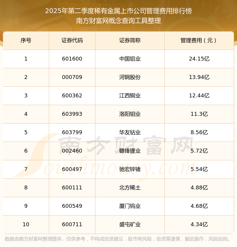 2025年第二季度,稀有金屬上市公司管理費用排行榜如下:中國鋁業(yè)(601600)的管理費用總額高達24.15億,河鋼股份(000709)和江西銅業(yè)(600362)分別排名第二和第三,洛陽鉬業(yè)(603993)、華友鈷業(yè)(603799)、贛鋒鋰業(yè)(002460)、馳宏鋅鍺(600497)、北方稀土(600111)、廈門鎢業(yè)(600549)、盛屯礦業(yè)(600711)分別進入前十,其管理費用總額分別排名第4-10名。
