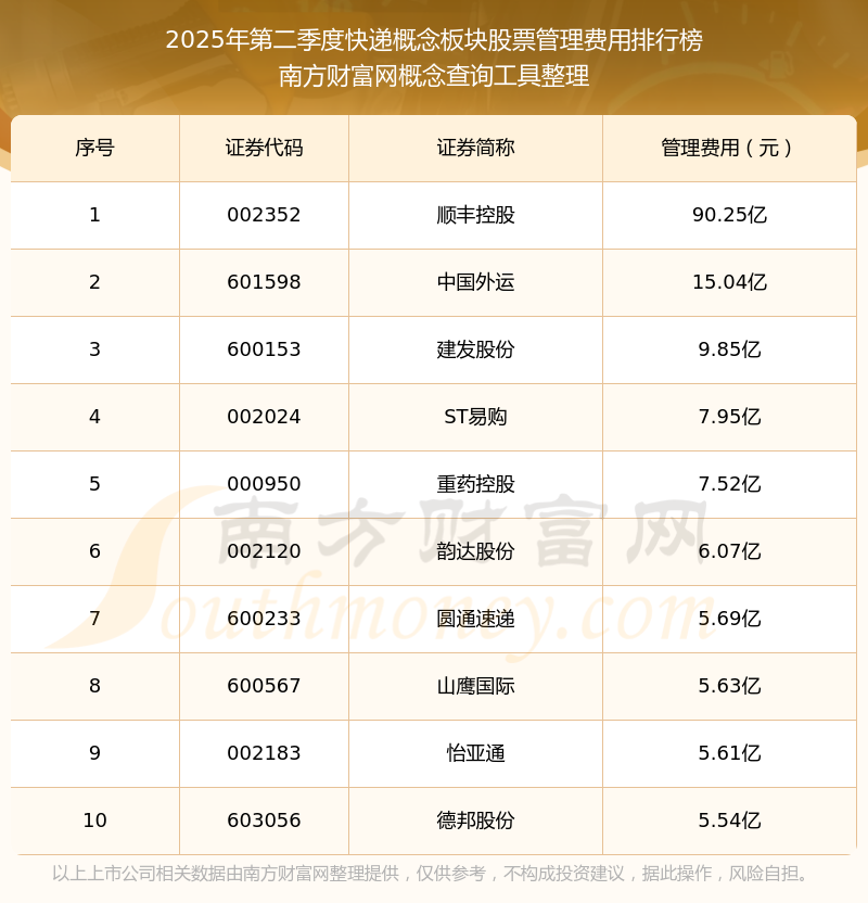 2025年第二季度,快遞概念板塊股票管理費用排名如下:順豐控股(002352)的管理費用總額高達90.25億,中國外運(601598)和建發(fā)股份(600153)位居第二和第三,ST易購(002024)、重藥控股(000950)、韻達股份(002120)、圓通速遞(600233)、山鷹國際(600567)、怡亞通(002183)、德邦股份(603056)分別進入前十,其管理費用總額分別排名第4-10名。