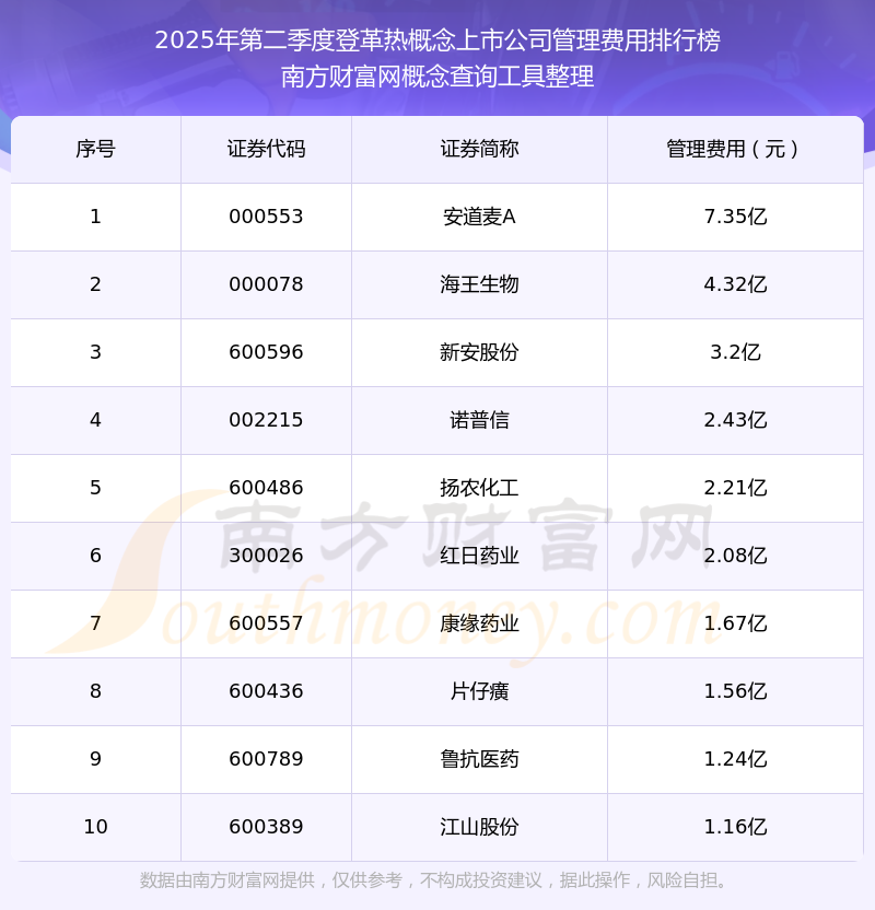 2025年第二季度,登革熱概念上市公司管理費(fèi)用排名中,安道麥A(000553)的管理費(fèi)用總額高達(dá)7.35億,海王生物(000078)和新安股份(600596)排名第二和第三,諾普信(002215)、揚(yáng)農(nóng)化工(600486)、紅日藥業(yè)(300026)、康緣藥業(yè)(600557)、片仔癀(600436)、魯抗醫(yī)藥(600789)、江山股份(600389)進(jìn)入前十,其管理費(fèi)用總額分別排名第4-10名。