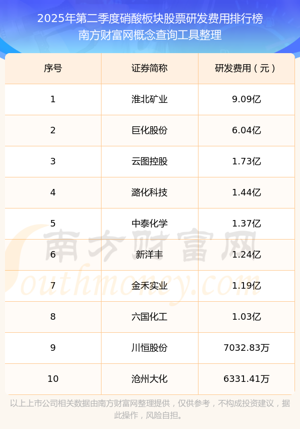 2025年第二季度硝酸板塊股票研發(fā)費用排行榜如下:淮北礦業(yè)(600985)研發(fā)費用總額高達(dá)9.09億,巨化股份(600160)和云圖控股(002539)分別排名第二和第三,潞化科技(600691)、中泰化學(xué)(002092)、新洋豐(000902)、金禾實業(yè)(002597)、六國化工(600470)、川恒股份(002895)、滄州大化(600230)分別進(jìn)入前十,其研發(fā)費用總額分別排名第4-10名。