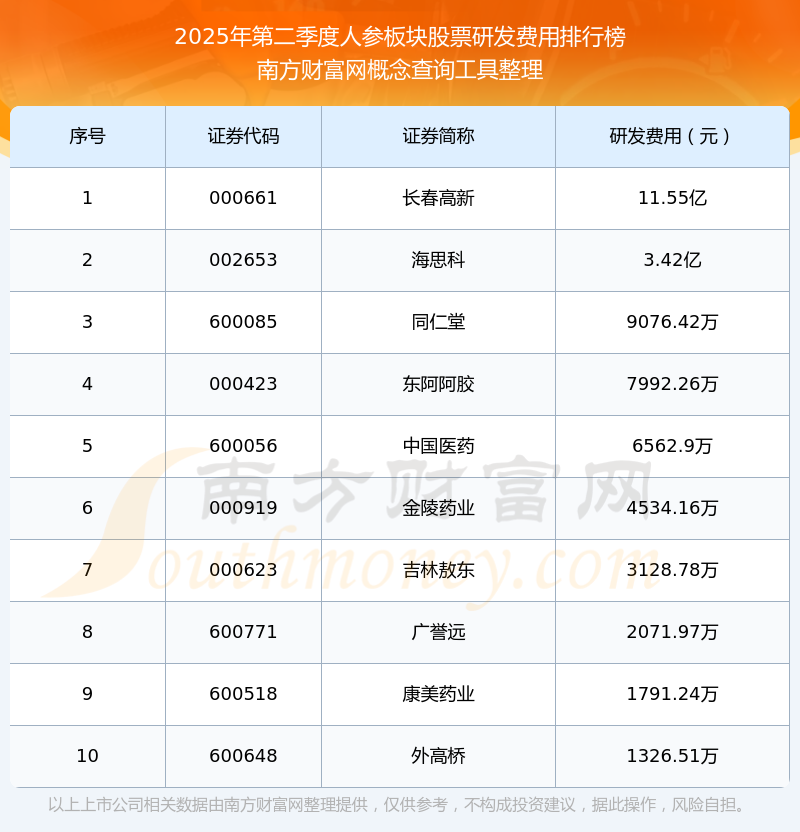 2025年第二季度人參板塊股票研發(fā)費(fèi)用排行榜如下:長春高新(000661)研發(fā)費(fèi)用總額高達(dá)11.55億,海思科(002653)和同仁堂(600085)分別排名第二和第三,東阿阿膠(000423)、中國醫(yī)藥(600056)、金陵藥業(yè)(000919)、吉林敖東(000623)、廣譽(yù)遠(yuǎn)(600771)、康美藥業(yè)(600518)、外高橋(600648)分別進(jìn)入前十,其研發(fā)費(fèi)用總額分別排名第4-10名。